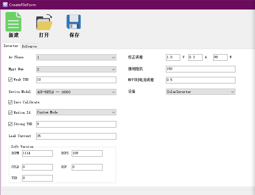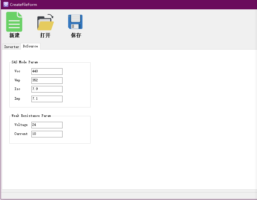- 点击文件菜单,选择新建调试脚本菜单,然后按照目标逆变器机型的实际要求输入参数,最后选择保存。后续使用即可。