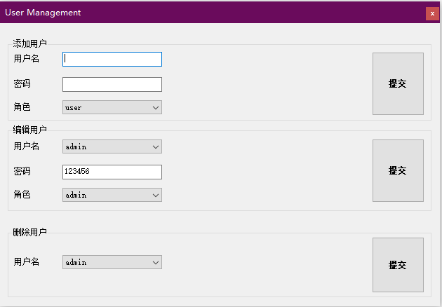 • 添加用户:请输入用户名和密码,然后选择用户的角色,点击提交按钮。提交成功之后编辑用户和删除用户列表中的信息也会同步联动。如果用户名已经存在相同项,则软件会提示冲突,您需要按照实际情况进行修改信息。