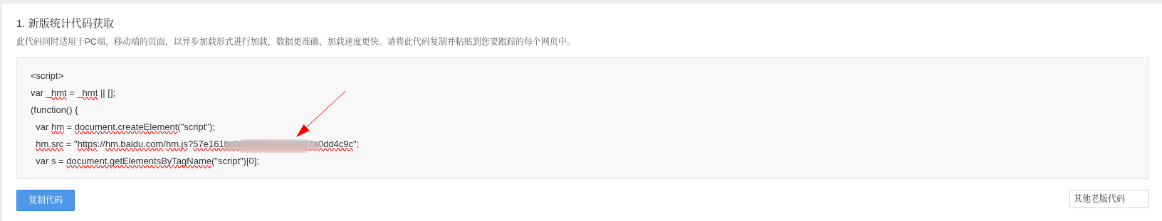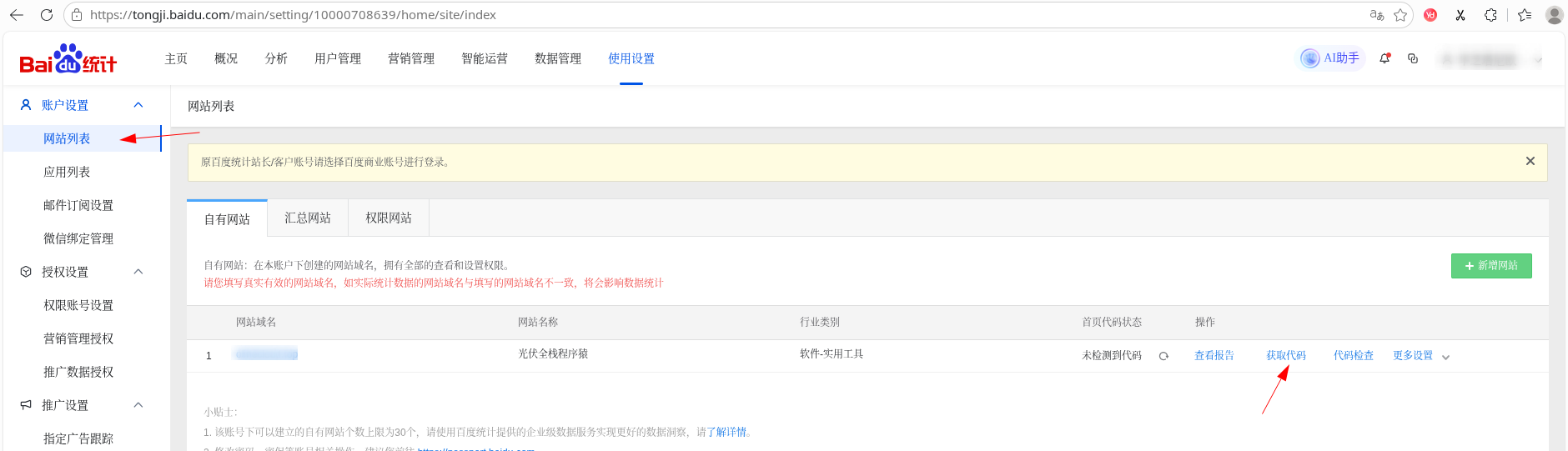- 在网站列表处找到自己的网站,然后点击获取代码。在代码中找到自己的统计id。